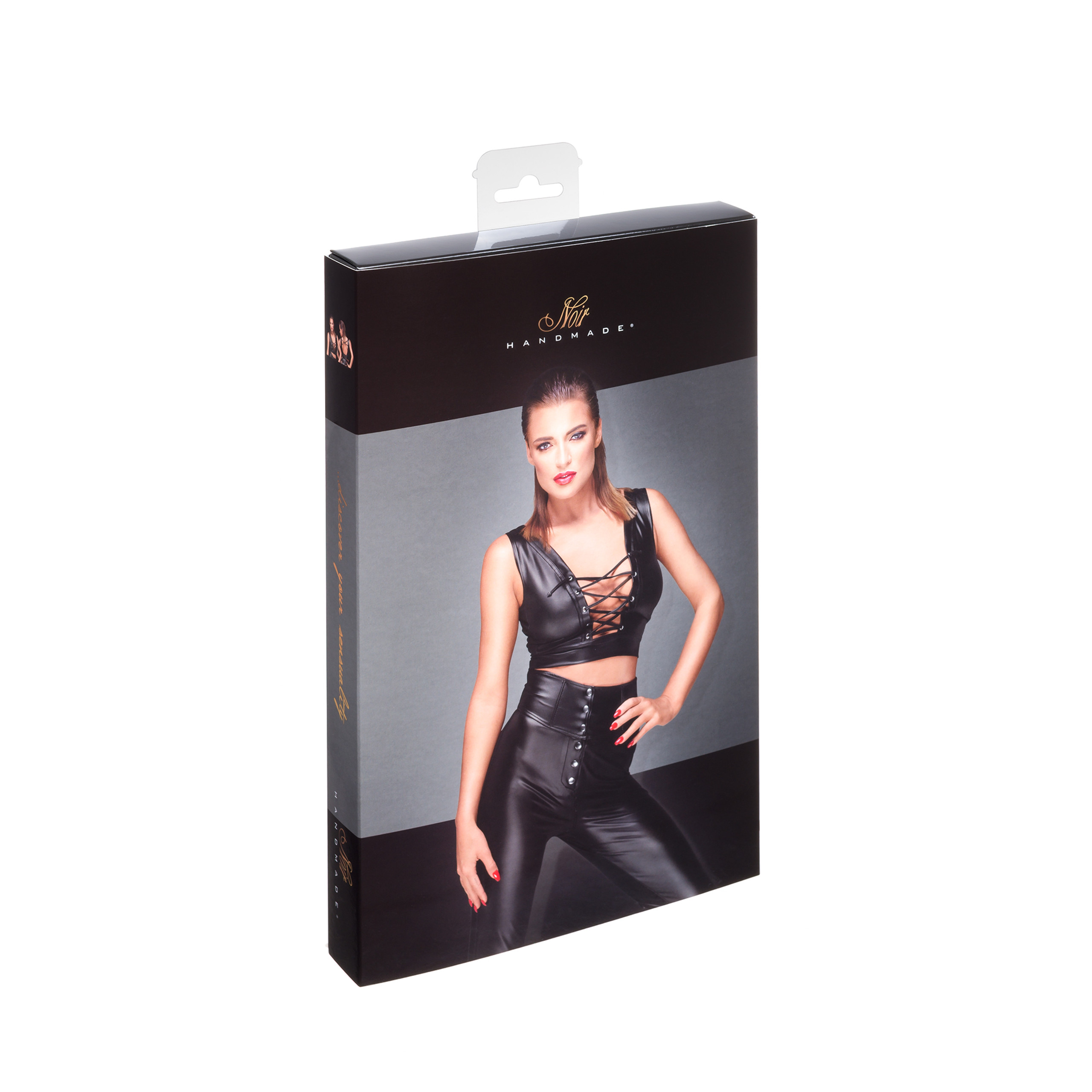 Aufsehenerregendes und freizügiges Powerwetlook-Top mit tiefer Dekolleté-Schnürung. Verstellbare Träger auf der Rückseite für eine enge Passform und feines Schließen auf Haken.