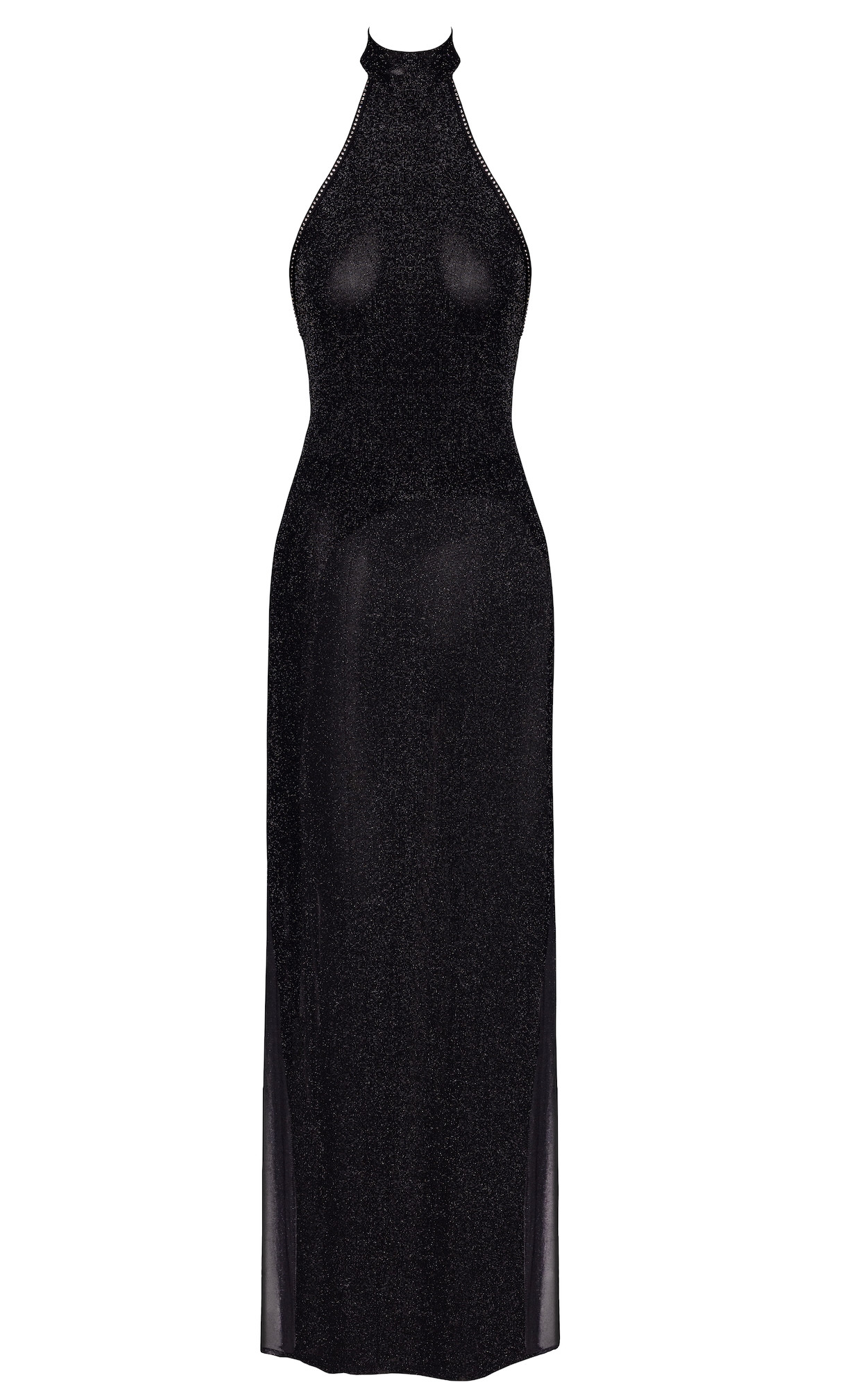 Design: Mit einem eleganten Stehkragen und zarten Hakenverschlüssen vereint das Kleid Anmut und Sinnlichkeit. Der gewagte, offene Rücken zieht alle Blicke auf sich und wird durch einen glitzernden Strassriemen in der Mitte für einen Hauch von Glamour akzentuiert. Tiefe Seitenschlitze verlängern die Beine und verleihen dem Kleid eine dramatische Bewegung, die seine markante Silhouette unterstreicht.